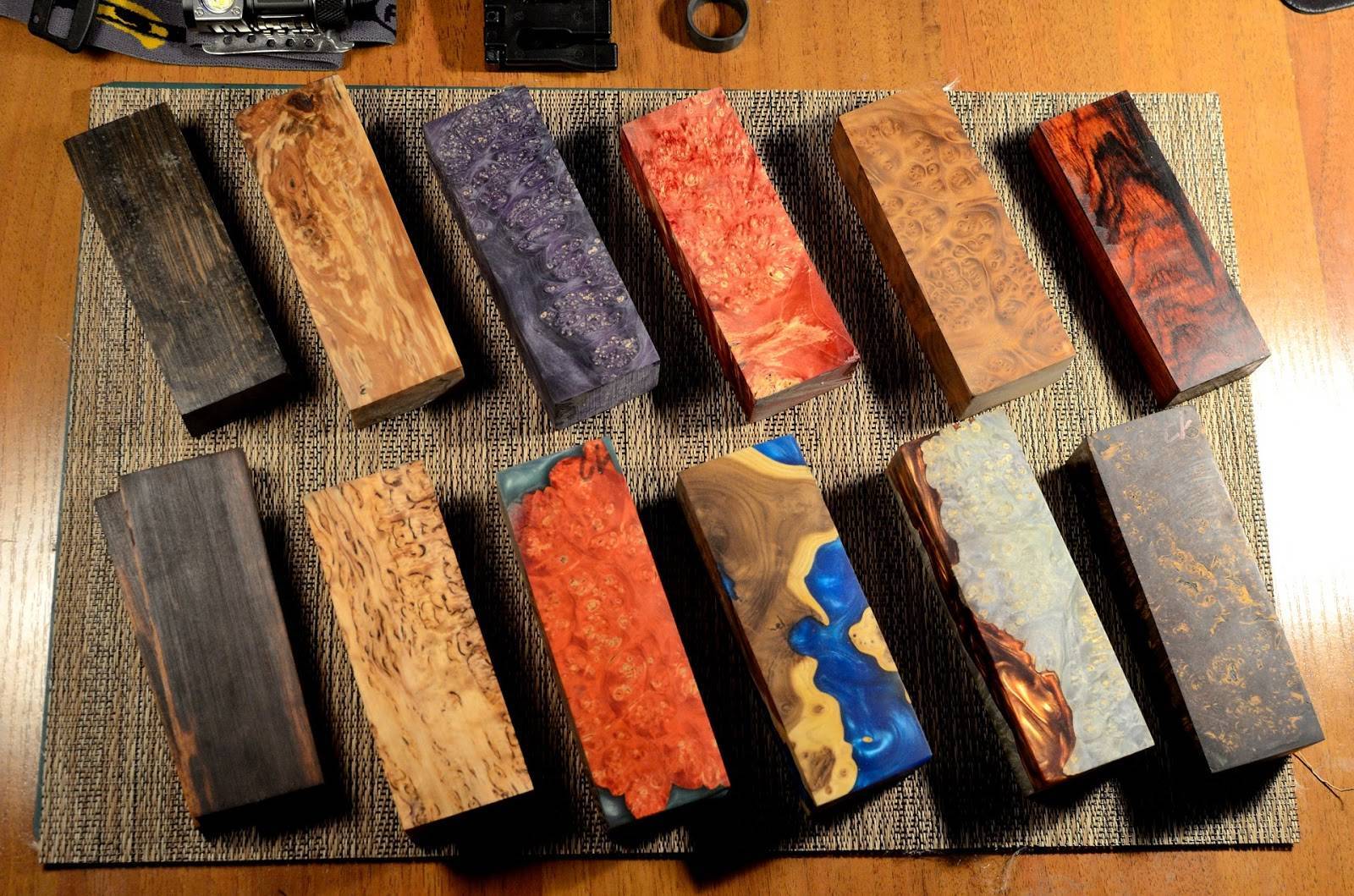 На металлический клинок могут быть насажены и несколько разных брусков – это разнообразит рисунок ручки ножа на выходе. После придания формы рукояти она тщательно шлифуется, пропитывается специальным маслом и покрывается воском. В качестве пропитки используется льняная олифа. Применяют также посудный лак, чистое минеральное масло. Таким образом подчеркивается особенность текстуры дерева и эксклюзивность изделия.