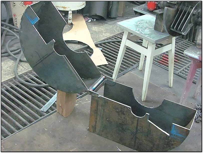 Для защитного кожуха, и воронки для приемного бункера подойдет листовое железо толщиной 8–12 мм. Листы нарезаются в размер и свариваются в конструкцию так, как указывают чертежи. Нарезаем все детали по заранее подготовленным «выкройкам» (их делаем из плотного картона) Ребра жесткости делаются из уголков, швеллеров или труб.