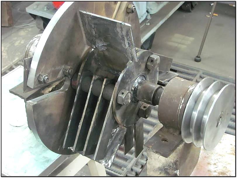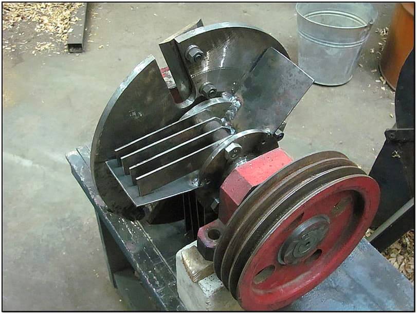 Каркас дробилки сваривают из металлических труб или же уголка, а на него монтируется мотор. Из листа прочного металла делается корпус. На длинную шпильку нанизывают режущие диски, чередуя их с шайбами. Когда режущий узел собран, на ось надевают шкив. Можно использовать шкив от любого генератора легковой машины. А для обеспечения вращения на ось устанавливается пара подшипников. Рама и кожух окрашивается защитной краской.