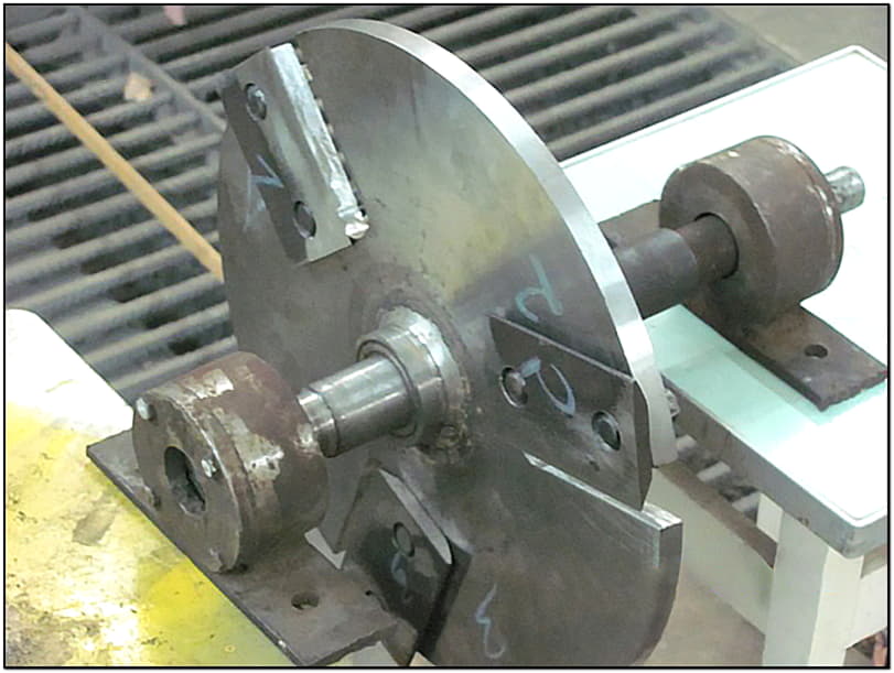 Важно! Сам режущий узел не должен цепляться за стенки корпуса, поэтому чтобы режущий узел свободно размещался в корпусе, диаметр маховика должен быть меньше размера корпуса на 30–50 мм. Оборудование дробильного узла: цапфы вала, на которые необходимо насадить опорные подшипники, плюс била (молотки) и режущий диск. Следующий шаг по изготовлению щепореза — нужно вырезать отверстия для рабочего вала, а также входные и выходные раструбы для подачи сырья и выхода щепы