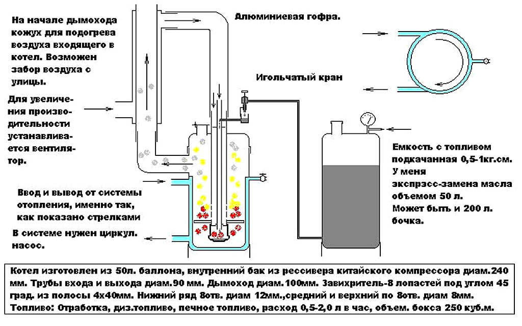 Построить капельный котел для системы водяного топления с естественной термосифонной циркуляцией возможно, но в таком случае усложняется его конструкция и становится необходимым принудительный наддув воздуха в рубашку охлаждения топливопровода. Если вы желаете отапливаться непременно дизтопливом или просто нечем больше, то чертежи капельного отопительного котла с естественной циркуляцией теплоносителя в водяной рубашке см. на след. рис.