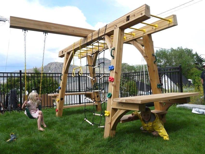 Соорудив нехитрую конструкцию, можно создать для ребенка целую спортивную площадку. Всё, что вам понадобится – это шведская стенка и веревочные конструкции (сетки, качели и гимнастические кольца с канатами). Их при желании также можно смастерить самостоятельно, имея навыки работы с деревом.