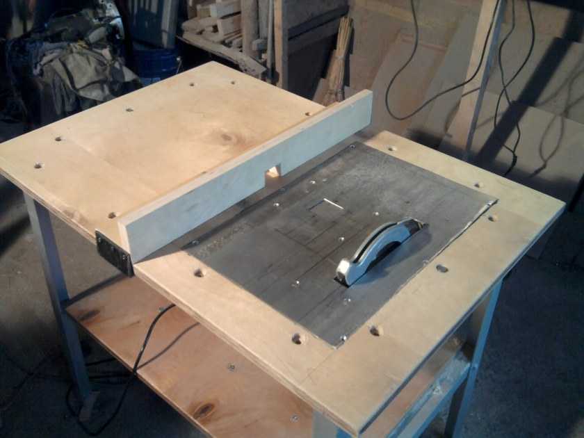 Посредине столешницы делают прямоугольное окно, которые затем закрывается вставкой из дюралюминия или оргстекла с прорезью для диска. Такая вставка позволяет обеспечить плавное перемещение обрабатываемой доски или листа вдоль линейки.