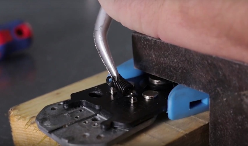Так пружины снять будет много удобнее. А воспользоваться для выполнения данной операции нужно загнутыми длинногубцами. Следует снять обе пружины, находящиеся с двух сторон инструмента.