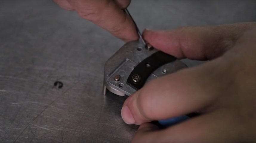 Сняв крышки, инструмент поворачивают другой стороной и демонтируют ограничитель провода.