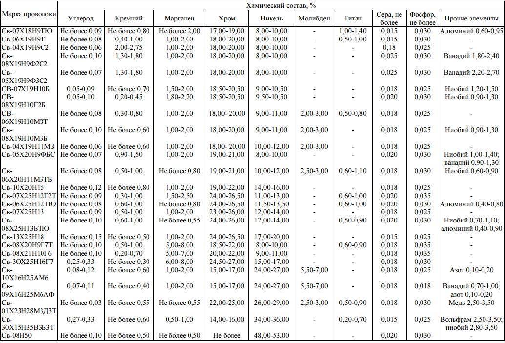 Марки и химический состав высоколегированной сварочной проволоки (нажмите для увеличения)