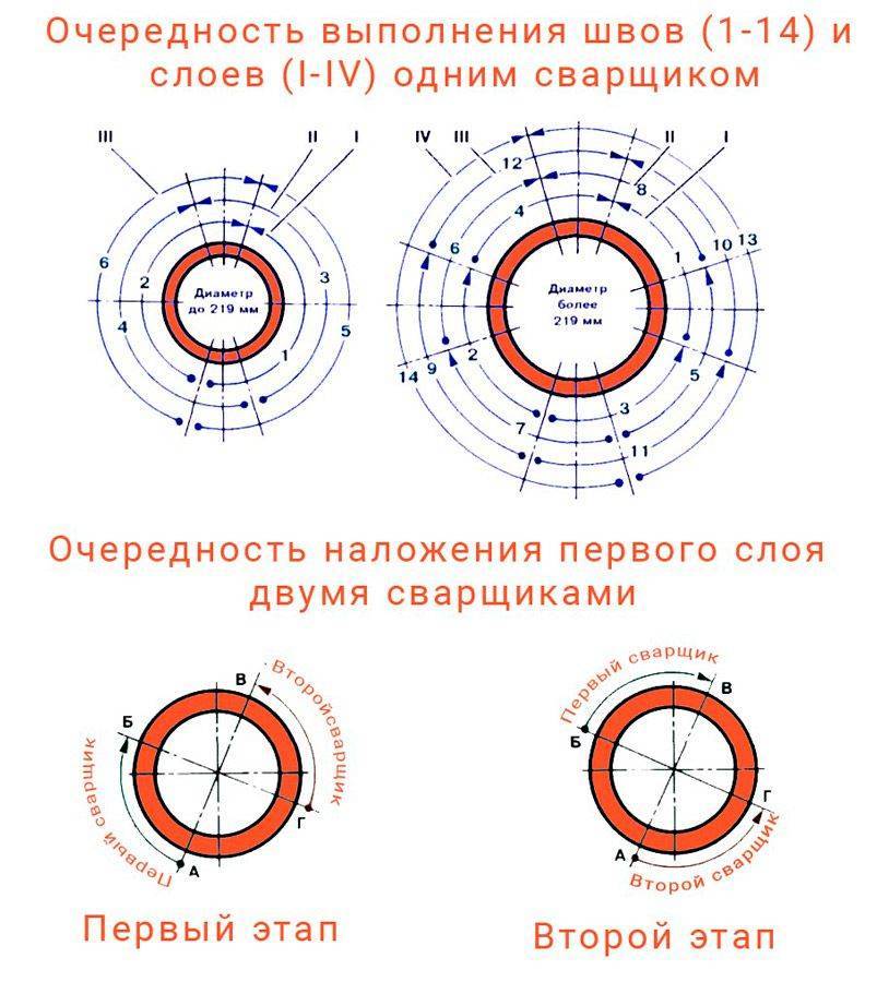 Ниже приведены схемы сварки горизонтальных и вертикальных стыков одним и двумя сварщиками.