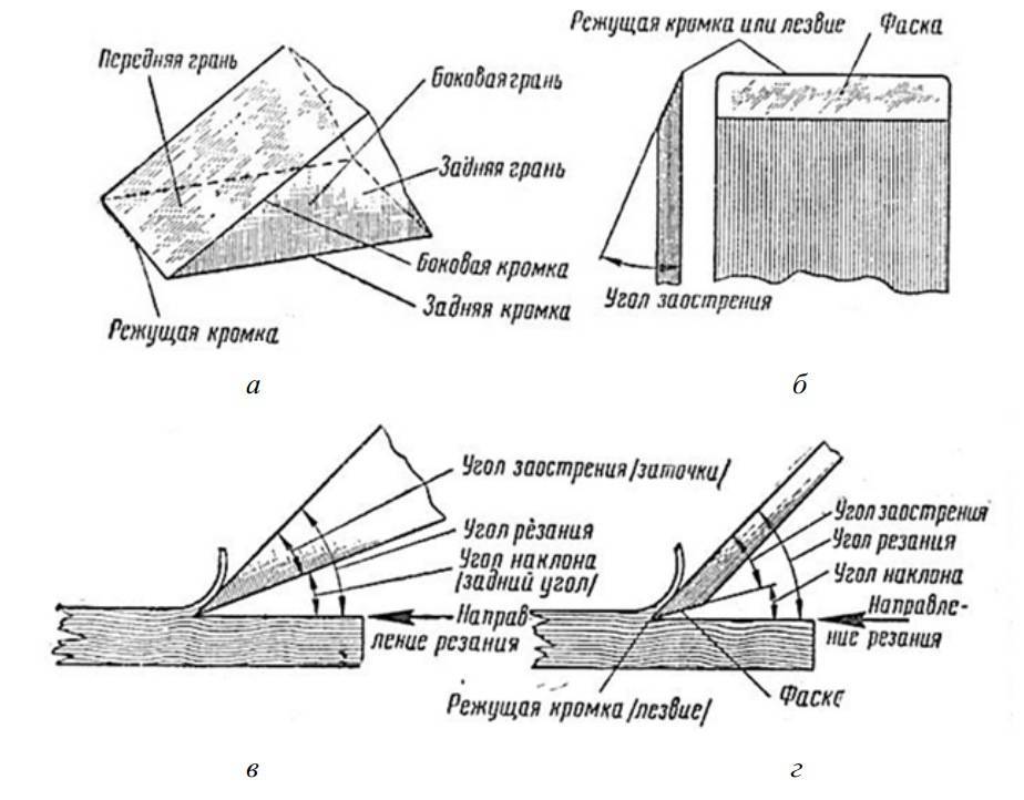 Рис. 2. Элементы и углы резца: а – элементы резца; б – рабочая часть рубаночного ножа; в – углы резца; г – углы рубаночного ножа