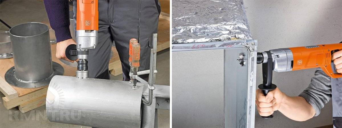 Сверлить отверстия большого диаметра лучше в несколько этапов, постепенно увеличивая диаметр сверла. Это не только снизит нагрузку на инструмент, но также продлит срок жизни заточки и обеспечит чистоту обработки. Отверстия диаметром свыше 13 мм лучше сверлить с помощью коронок. Вместо масла рекомендуется использовать консистентную смазку, так будет меньше брызг. Коронке нужно периодически давать время остыть, а во время работы тщательно следить за тем, чтобы зубья погружались равномерно, иными словами — держать шпиндель строго перпендикулярно поверхности детали.