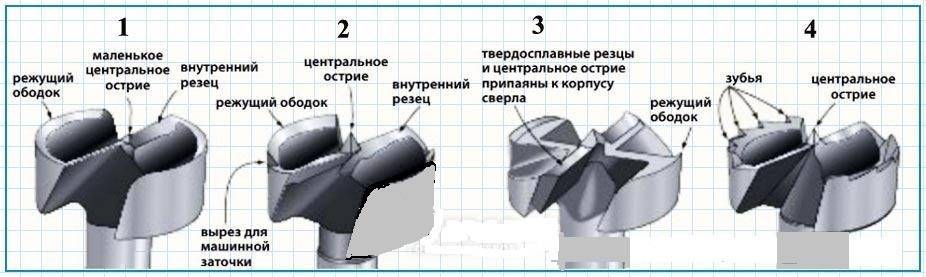 Сверло Форстнера: 1 – оригинальное; 2 – для машинной заточки; 3 – с твердосплавными резцами; 4 – с зубьями