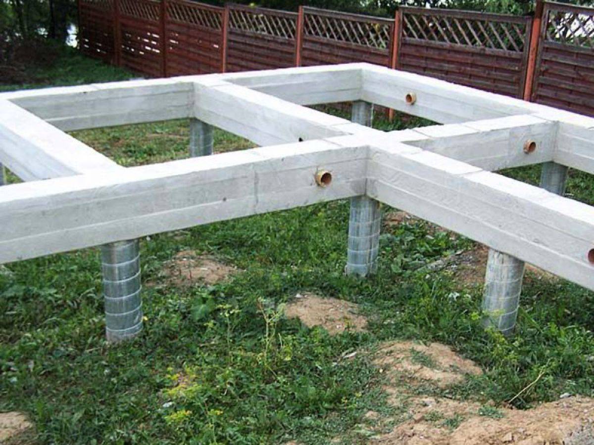 - Второй вариант заключается в установке независимой несущей системы, устанавливаемой на сваях. Такая опорная конструкция называется ростверком. При правильном расчете и качественном исполнении нагрузка на сваи распределяется равномерно. Строение монтируется на обвязке по ростверку и имеет ограничения по массе. Отличный вариант для каркасных домов и строений из СИП панелей.