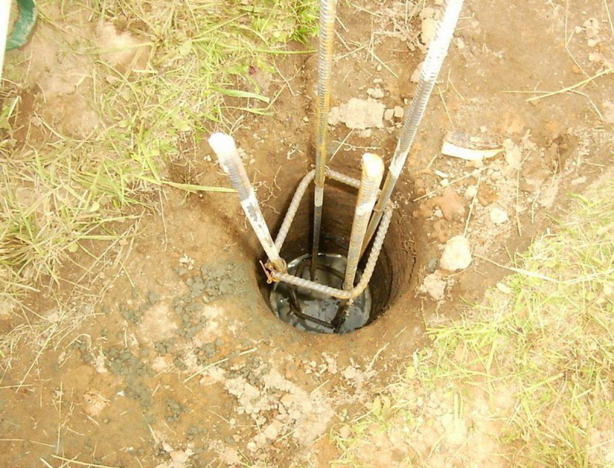 После подготовки скважины под заливку бетоном конструкцию укрепляют, проводя армирование. Для этого используют железные пруты диаметром 10-12 мм. Перед установкой арматура очищается от грязи, краски и коррозии, для улучшенной адгезии с бетоном. Получившаяся металлическая конструкция устанавливается в скважину.