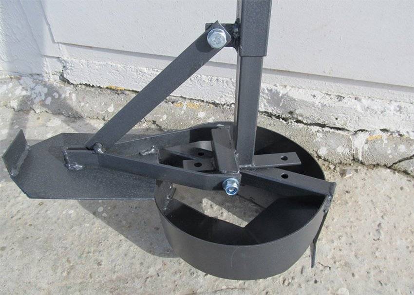 Свая может просто сломаться! Когда достигнете проектной отметки, приступайте к расширению низа скважины. Выкрутите на контейнере два болта. Установите и закрепите плуг. Здесь надо отметить, что плуг можно установить в три разные позиции. Для расширения низа на 400, 500 и 600 мм (смотрите в инструкции). Прикрутите к кронштейну верёвку и поднимите плуг в транспортное положение. Осталось опустить плуг в скважину, освободить верёвку и, проворачивая против часовой стрелки, расширить низ. Работать желательно вдвоём.