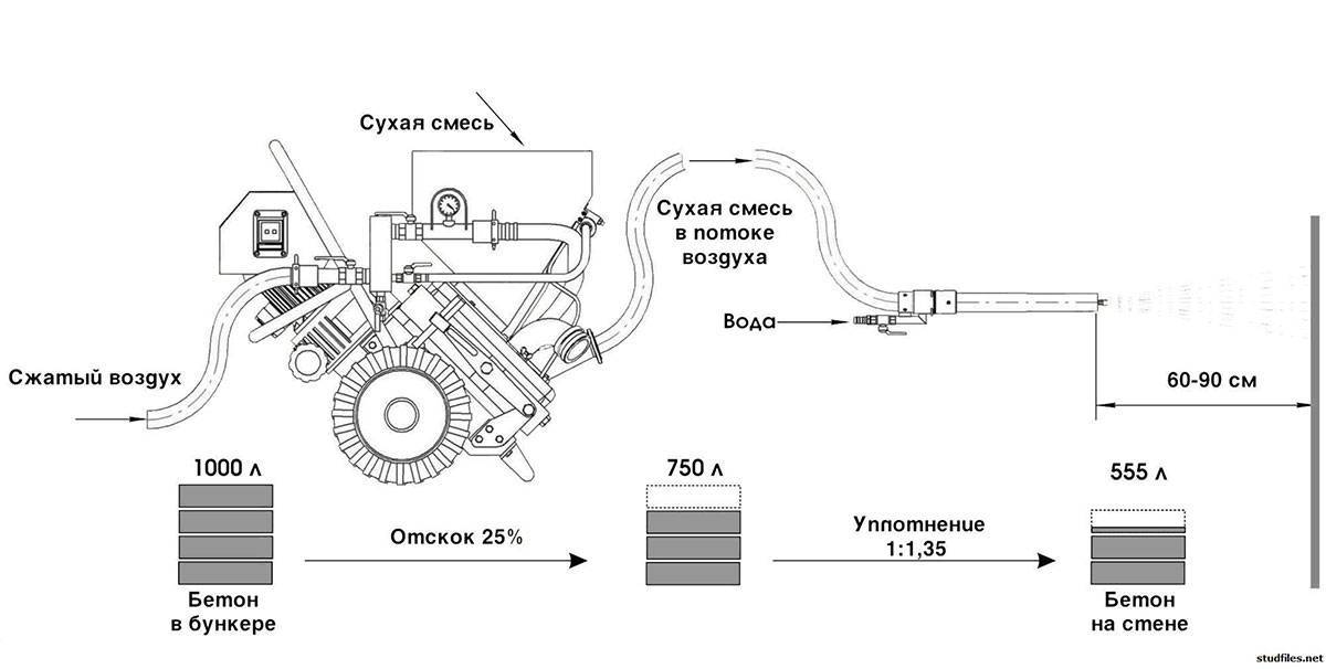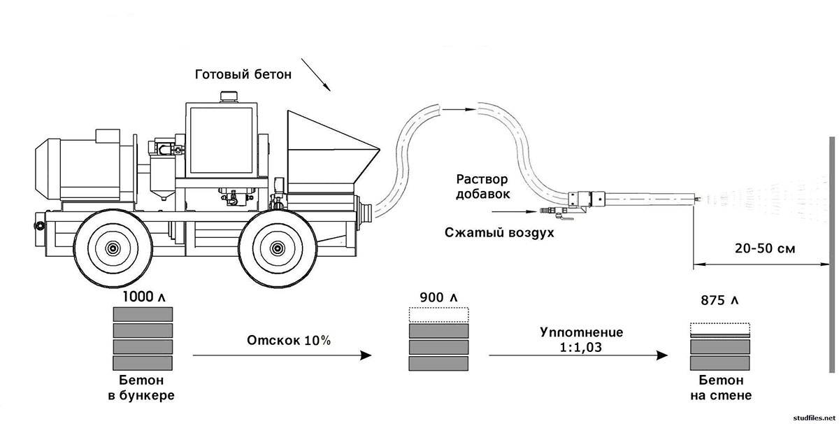 Состав смешивается с водой и под давлением выдувается на обрабатываемую поверхность. При ударе об основание происходит уплотнение бетона. Отдельный насос направляет добавки для ускорения затвердения.