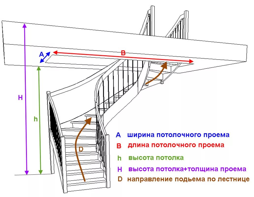 От угла лестничного марша будет зависеть величина проема в области потолка. Так, для складной конструкции потребуется небольшой проем, а для большего уклона потребуется более значительный (до 2 м).