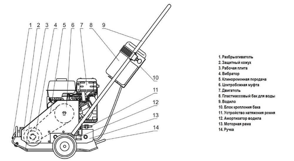 Основной частью и рабочей поверхностью является сама основная плита. Дальнейшая конструкция выстраивается именно по рабочей плите. Вибровозбудитель приводит плиту в действие. Состоит он из одного или нескольких валов и цилиндрического корпуса. В одновальных конструкциях предусмотрено движение машины только в одном направлении. Двухвальные являются реверсивными. Также к плите крепится моторная рама, на которую устанавливается двигатель. Если машина предназначена для трамбовки асфальта, то конструкция будет дополнена баком с водой.