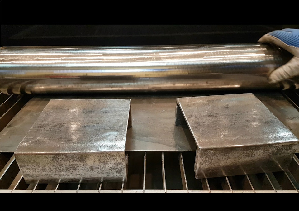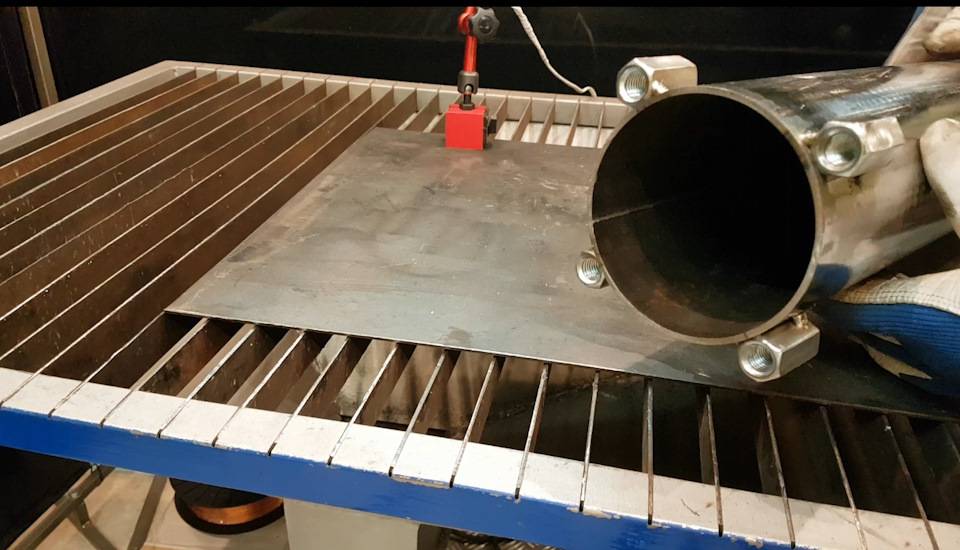 От трубы отрезал 80 см., от швеллера 2 квадрата 14х14 см. Все очистил от ржавчины.Для очистки трубы изнутри использовал круг проволочный 100 мм., с приваренной к нему шпилькой, зачистил не до блеска, но ржавчины и прочей дряни не осталось.