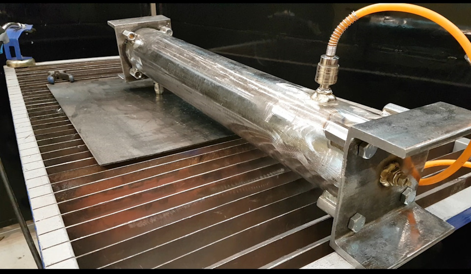 - На расстоянии 120 мм от нижней заглушки в стенку необходимо вварить патрубок через него будет поступать поток воздуха