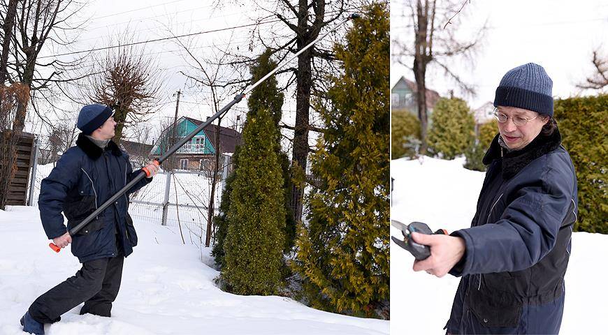 Одно-два дерева можно обрезать и с лестницы, но для нескольких деревьев лучше использовать секатор на длинной штанге, или высоторез.