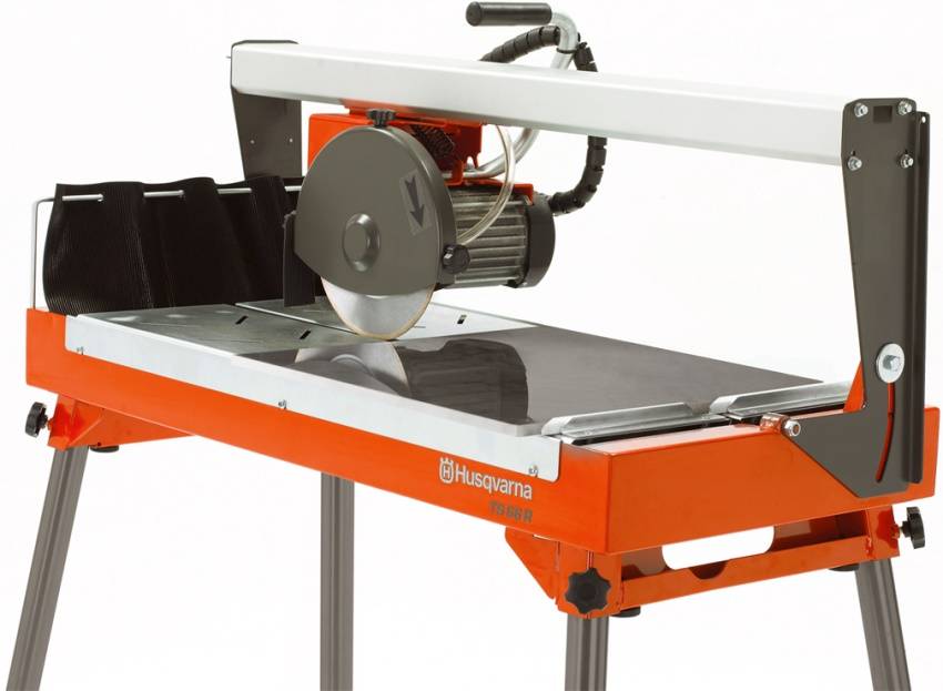 У этих моделей электрических агрегатов кафель фиксируется на основании. Двигатель и диск, который может менять наклон, расположены на каретке. Это значительно повышает качество реза.