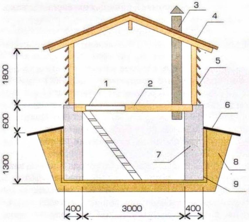 Погреб заглубленный на 1,3 м: 1 — люк в погреб; 2 — утепленное перекрытие; 3 — вентиляция; 4 — надстройка; 5 — жалюзийная решетка; 6 — отмостка; 7 — бутобетонная стенка; 8 — глиняный замок; 9 — битумная замазка