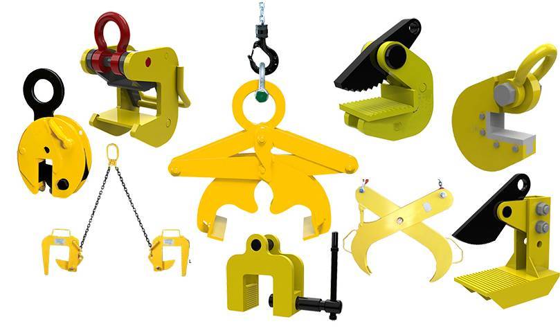 Грузовые захваты (для листового металла, для подъёма круглых деталей, для сортового проката, захват-струбцина для мягких панелей, для подъёма грузов с отверстием, для подъёма ящика, для подъёма поддонов, для подъёма рулонов стали, для подъёма колеса автомобиля, захват “Замок Смаля”, для бочек, для барабанов, для труб, для подъёма рельс, для балок таврового сечения)