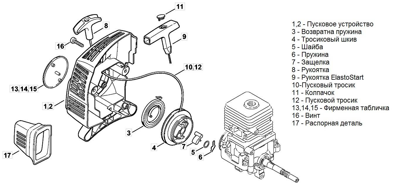 Стартер находится с правой стороны Хускварны и удерживается на нескольких винтах. Раскрутив которые, можно легко снять стартер и тем самым получить доступ к маховику и катушке зажигания.